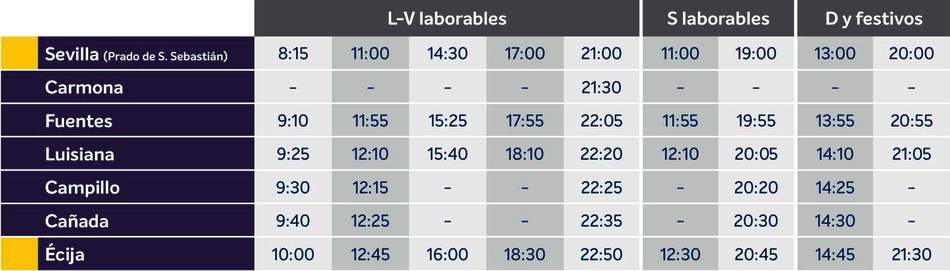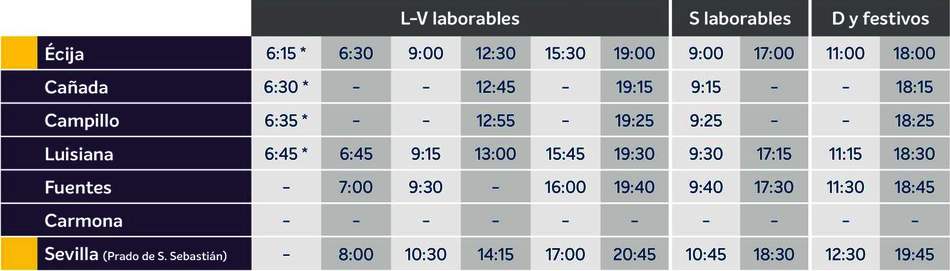 Estos horarios han sido recopilados de las propias webs de las líneas de autobuses, los cuales, pueden variar por diversas causas y en la época veraniega. Usted puede consultar los distintos horarios y trayectos de las llegadas y salidas desde la Ciudad de Écija, en las webs oficiales de las distintas compañías de autobuses y que esta página web pone a su disposición con un enlace directo a las mismas webs.