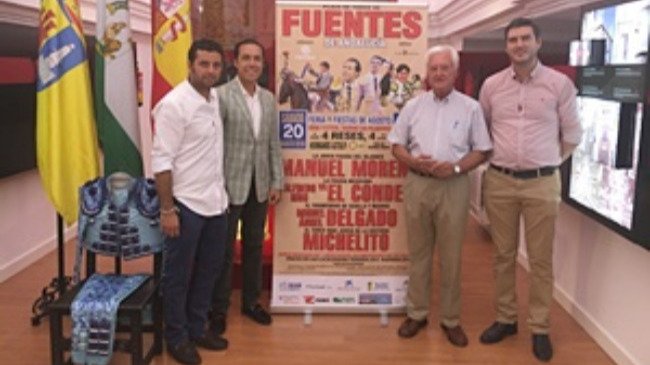 Tras lo cual, el Alcalde de Fuentes de Andalucía, Francisco Martínez, junto con la figura del toreo mexicana Alfredo Ríos “El Conde”, el gerente de Tauroemoción, Antonio Osuna, el director general de Agencia NODO, Ernesto de Novales y el presidente de Cáritas de Fuentes de Andalucía, José Prats, desvelaban el cartel del festejo taurino.
